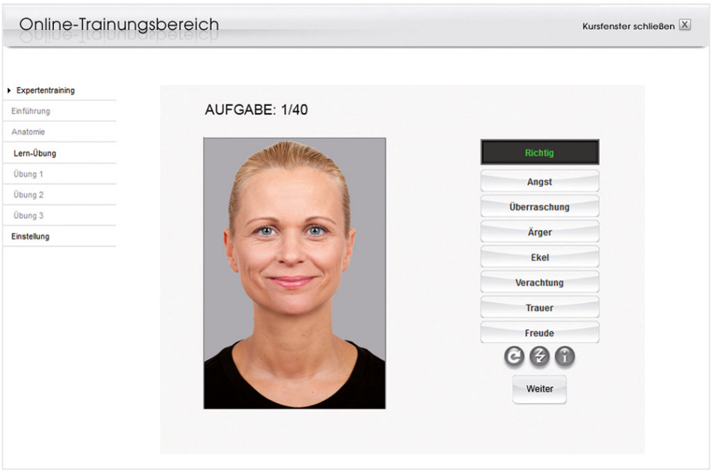 Dieser weltweit einzigartige Kurs vermittelt umfassendes Hintergrundwissen zur Entstehung von Gesichtsausdrücken und deren Decodierung. Lernen Sie in diesem Kurs nicht nur kleinste Bewegungen und subtile Signale in der Mimik zu erkennen, sondern tauchen Sie ein in die Anatomie des menschlichen Gesichts und deren wichtigsten Bewegungseinheiten. Darüber hinaus trainieren Sie in 145 Trainingsaufgaben (ohne Wiedererkennungs-Effekt) die neuen Erkenntnisse anzuwenden.